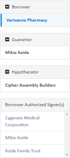 In this example, a Borrower Authorized Signer(s) section is displayed under the main entity sections with the name of each entity in the current transaction assigned with that role.