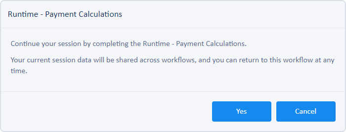 When you are working with a transaction in Simplicity Runtime - Loans, a Switch to Runtime - Payment Calculations tab may be available. When you click that tab, you are prompted to continue or cancel the action. All data you have entered in the current workflow is automatically saved when you switch to the next workflow. Upon entering the Payment Calculations workflow, you can switch back to the Loans workflow by clicking the Switch to Runtime - Loans tab. You can switch back and forth between workflows as often as necessary.